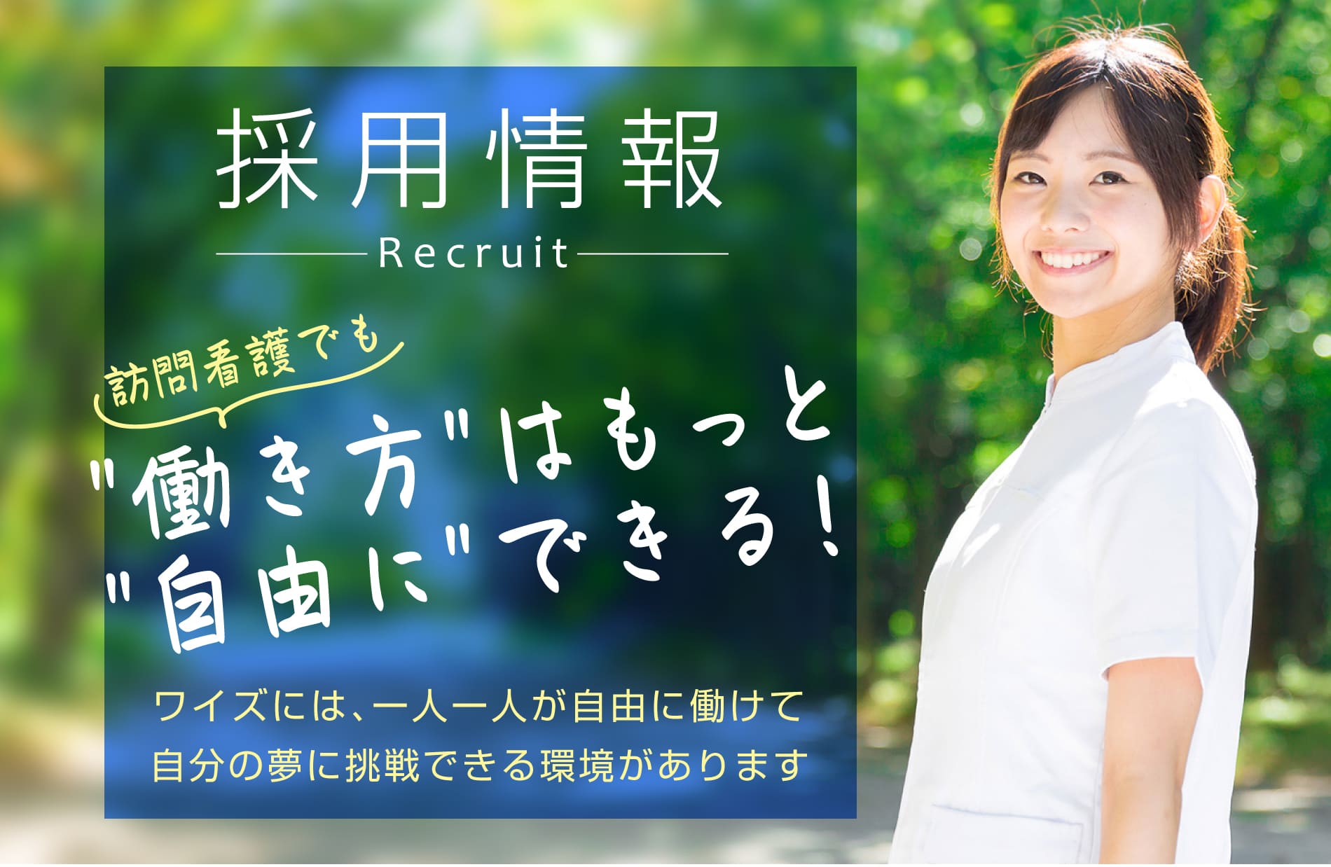ワイズ訪問看護リハビリステーション調布 住み慣れた場所で活き活きと生活できるよう、サポートさせていただきます。 ステーション案内 365日、24時間、住み慣れた地域・住み慣れたご自宅で少しでも長く生活をしていただけるように支援させていただきます。看取りサポートも行っています。 詳しくはこちら サービス案内 看護師、療法士等が生活の場に訪問し、看護ケアや日常生活動作の維持・向上のためのリハビリテーションを提供し、安心して過ごせるようにサポートします。 詳しくはこちら 一緒に働く仲間を募集しています! 将来独立起業してみたい、プライベートもしっかり充実させたい、子育てしながら働きたいなど、 様々な働き方を可能にしていきます。 一人ひとりの人生設計を踏まえた柔軟な働き方を一緒に創っていきましょう。 採用情報 訪問看護でも”働き方”はもっと”自由に”できる! ワイズには、一人一人が効率よく自由に働けて、自分の可能性を伸ばせる環境があります。 詳しくはこちら 代表メッセージ ワイズ代表の横山です。ワイズ訪問看護ステーションをもっと知っていただくために、私たちの会社のこと、考え方、今後の目指す方向などをご紹介します。 詳しくはこちら 独立起業支援制度 将来独立したいという強い意志を持つ方を応援する制度です。既に当ステーションから1名が訪問看護ステーションの経営者として独立を果たしています。 詳しくはこちら ワイズからの看護師独立 事例インタビュー 【ワイズからの看護師独立事例】「ワイズで学んだことを活かして自分のチームを作りたい」 前管理者のインタビューをご覧いただけます。 詳しくはこちら ワイズのメンバーをご紹介します! ワイズ訪問看護ステーションをもっと知っていただくために、メンバーの想いをインタビュー形式でご紹介します。 訪問看護のこと、やりがい、ワイズに入社した動機などを率直に語ってもらいました。 詳しくはこちら 勤務地 ワイズ訪問看護リハビリステーション 調布 Tel:042-442-9021 Fax:042-442-9022 〒182-0022 東京都調布市国領町1-40-6 モンターニュ国領409 京王線 国領駅より徒歩3分 お気軽にお問い合わせください。 042-442-9021 受付時間 8:45~17:45 [ 土・日・祝日除く ] お問い合わせ Facebook twitter