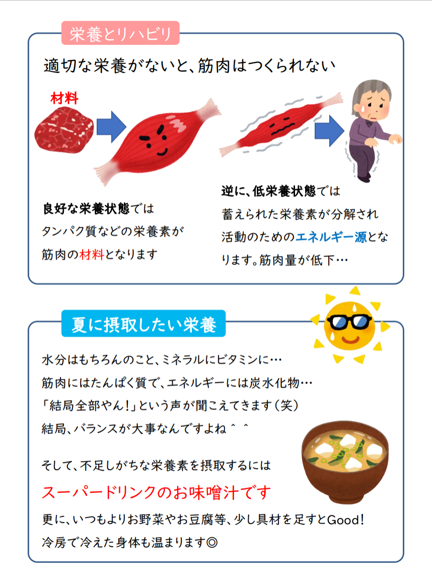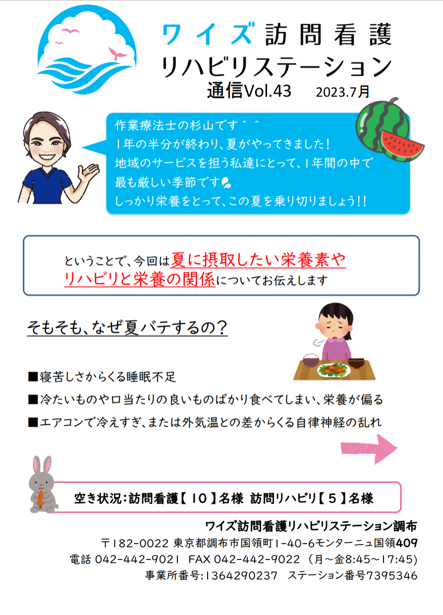 2023年7月26日 / 最終更新日 : 2023年7月26日 W ステーション日誌 ワイズ通信 Vol.43 夏に摂取したい栄養素やリハビリと栄養 連日猛暑が続きますね・・・ この時期になると訪問するスタッフの方が心配されることがしばしば. 引き続き耐え抜いていきましょう! さて、今回のワイズ通信は夏におすすめな料理も書いてあります! ぜひご参照ください! Follow me! Facebook twitter